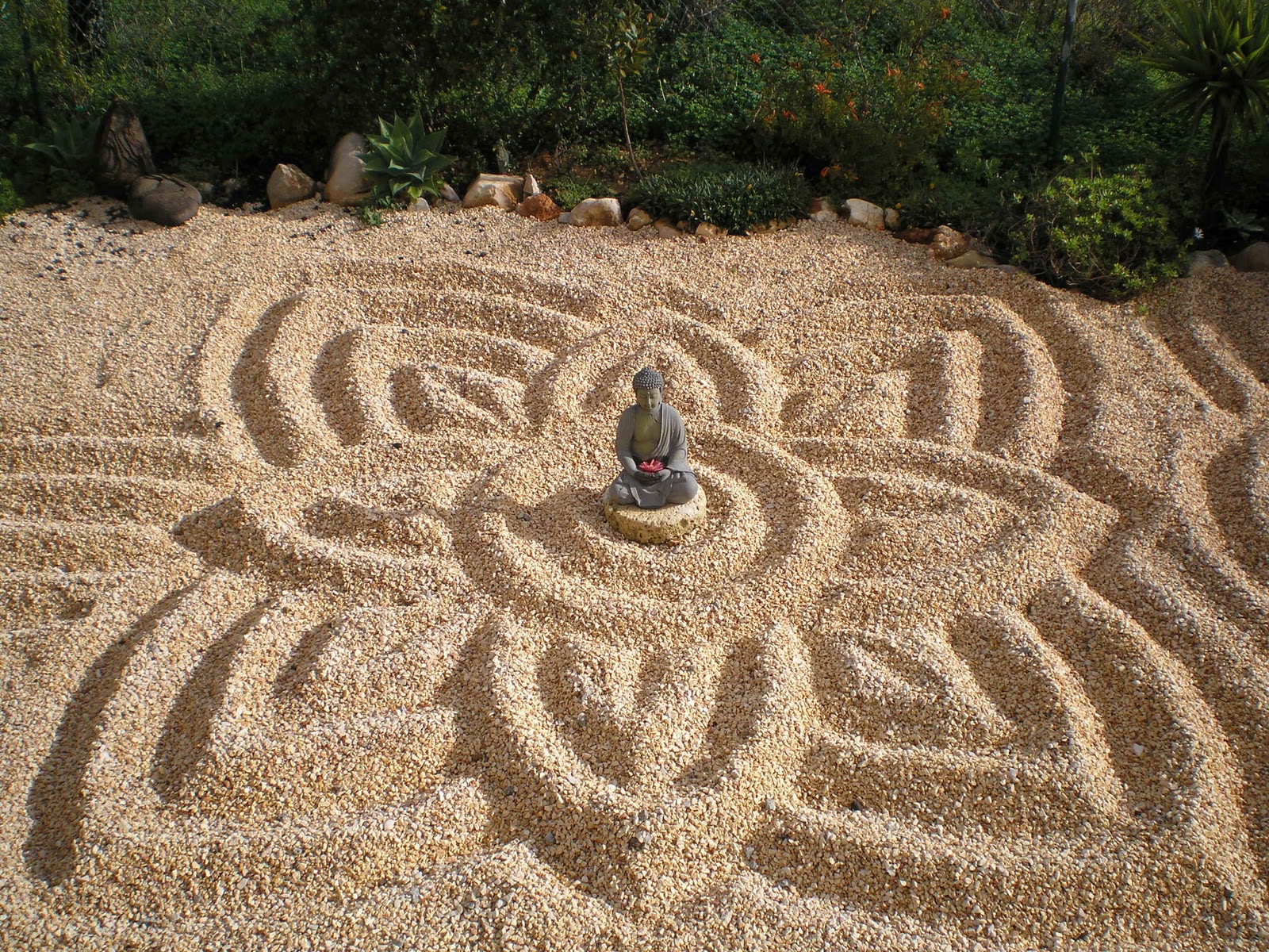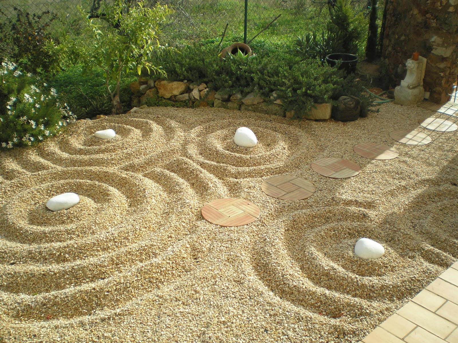 Esta pode ser uma opção interessante para jardins de baixa manutenção, pois permite decorar espaços de uma forma barata, e com a vantagem de poder ser mudada sempre que se sinta vontade de o fazer. A meu ver, é uma excelente terapia e tenho por hábito mudar os desenhos, no mínimo, uma vez por estação. Tecnicamente falando, deve ser feito um isolamento da área com uma tela impermeável, específica para jardins, e a brita que utilizo tem a designação corrente de "bago de arroz" (3 a 6 mm). Nas fotos, utilizei uma brita mais grossa, porque este jardim é frequentado por muitos gatos com uma grande vontade de fazer buracos!!