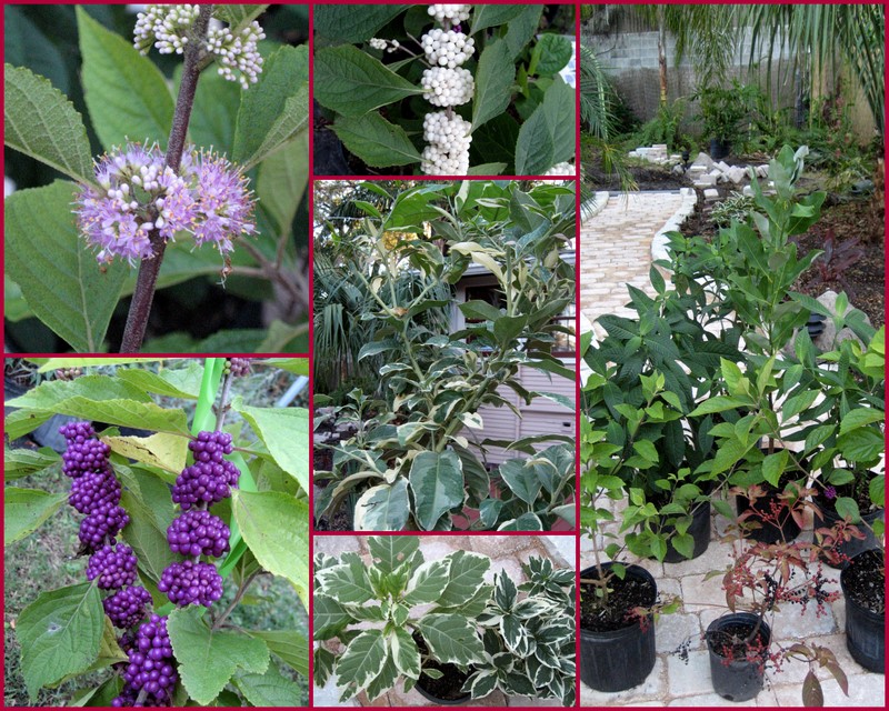 Mais um dia de compras, e mais umas plantas seleccionadas para aumentar a paleta de cores do jardim. Como há muita sombra, a opção por espécies variegatas ajuda a quebrar a "monotonia" do verde, além de ter escolhido algumas que dão flor e fruto com muita cor. E as escolhidas foram: Brugmansia (trompeta-de-anjo), Hydrangea macrophylla variegata (hortênsia), Callicarpa ("beautyberry"/amora americana), Forestiera segregata, Magnolia L. (magnólia virginiana), Hamelia patens ("fire bush") e o limoeiro variegata, que foi colocado num vaso no deck. À excepção das variegatas, todas as outras foram escolhidas por serem plantas locais, logo bem adaptadas ao clima, além de, esperemos, poderem vir a alimentar alguma da fauna local com os seus frutos coloridos e as suas flores. Pode ser que, assim, não seja só o guaxinim de estimação do Rui a visitar o jardim, apesar de nunca ter sido formalmente convidado...
