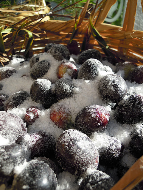 Primeiro, quero pedir desculpas por eventualmente ter induzido em erro quem segue este blog. Ao trocar informações com alguns amigos (mais algarvios do que eu...), fiquei a saber que as melhores azeitonas para o sal são as mais roxas ou as quase pretas, e devem ser lavadas antes da junção do sal. Daí não ter tido muito sucesso com as minhas belas azeitonas verdes :-( Isto é o que acontece quando alguém da zona de Sintra tenta ser algarvio!